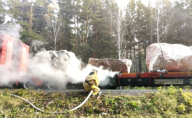 «Хорошо, что булыжники не горят…»: грузовик, перевозивший огромные камни в Сатку, загорелся