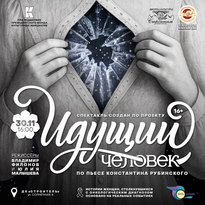 АНО «Жить дальше» является партнером областного онкоцентра (ЧОКЦОиЯМ) и центров амбулаторной онкологической помощи Челябинской области (ЦАОП). До и после спектакля любой желающий сможет записаться на скрининг по онкопрофилю в своем городе или на бесплатную консультацию онкопсихолога офлайн или онлайн, скачать гайдлайны для пациентов по онкологическим заболеваниям Национальной всеобщей онкологической сети.