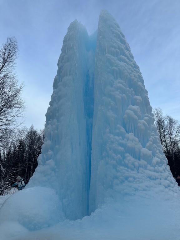 Погодные условия позволили ледяному фонтану вырастить широкое основание. Ледяная глыба уже достигла высоты почти 15 м. Прежний рекорд — 16 м.