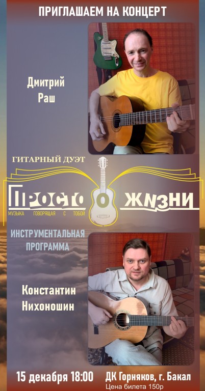 15 февраля в ДК Горняков города Бакал выступит гитарный дуэт «Просто о жизни». Два музыканта с классическими гитарами — Константин Нихоношин и Дмитрий Раш — представят программу, где простота мелодий раскрывает глубину жизненных историй. Это не просто концерт, а разговор души с душой через струны. Живой звук, тишина и воспоминания — обещают музыканты.