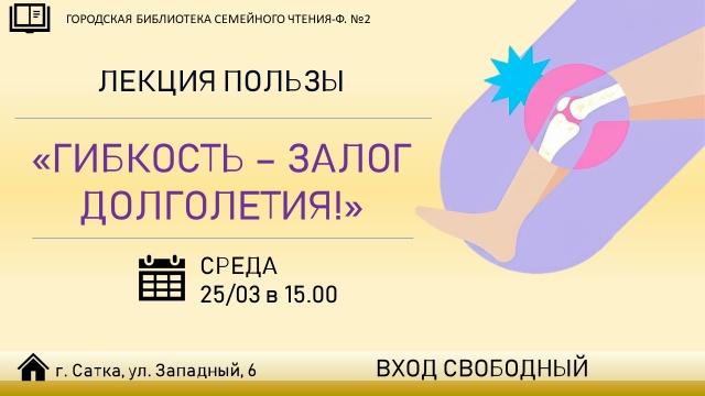 25 марта в 15.00 в Библиотеке семейного чтения (ул. Западный, 6) состоится полезная для многих встреча: преподаватель клинических дисциплин Саткинского медицинского колледжа и специалист по адаптивной физической культуре для лиц с ограничениями здоровья Анастасия Баширова расскажет, как заботиться о суставах, поговорит об остеопорозе и его профилактике, покажет эффективные упражнения, которые помогут облегчить состояние при заболеваниях опорно-двигательного аппарата. Эксперту можно будет задать вопросы.