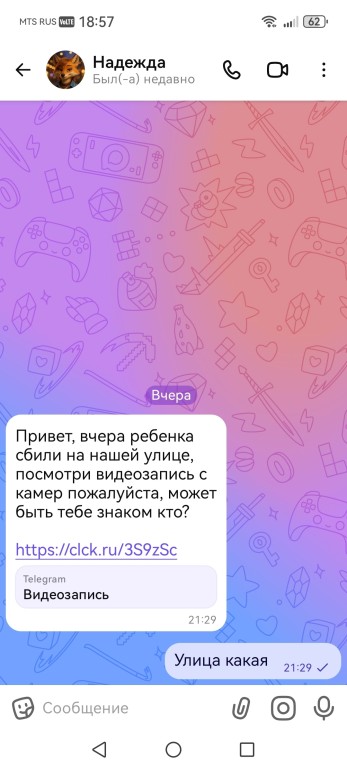 «Привет, вчера ребенка сбили на нашей улице, посмотри видеозапись с камер, может быть тебе знаком кто?».